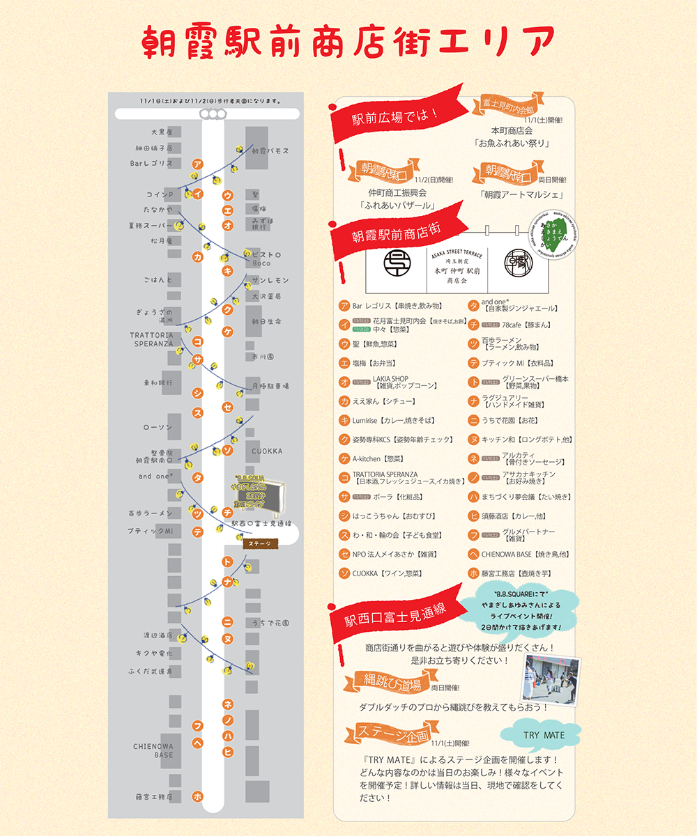 朝霞駅前商店会、朝霞本町商店会、仲町商工振興会、富士見町内会、埼玉大学、朝霞市文化スポーツ振興公社、朝霞市商工会青年部、食いち関係者各位、林土木、くみまちモール朝霞(カインズ) ※順不同