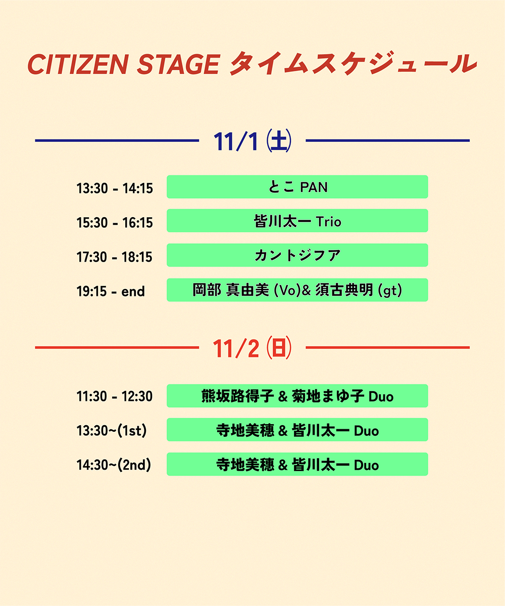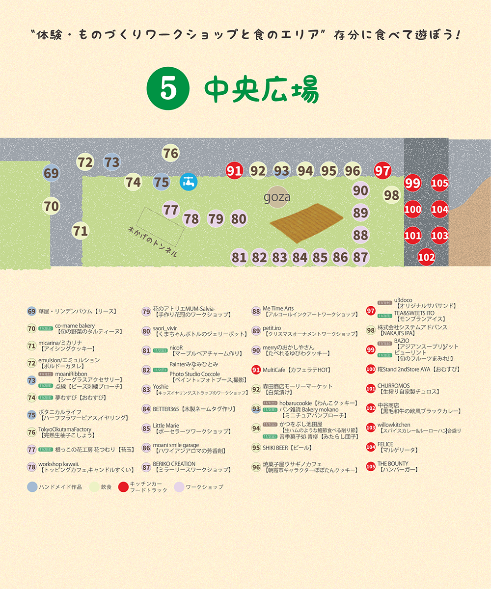 アーティストの演奏やフードトラック出店、ハンドクラフト雑貨、朝霞フード、さらには自然と触れ合えるアクティビティなど五感を刺激するコンテンツが盛りだくさんです。