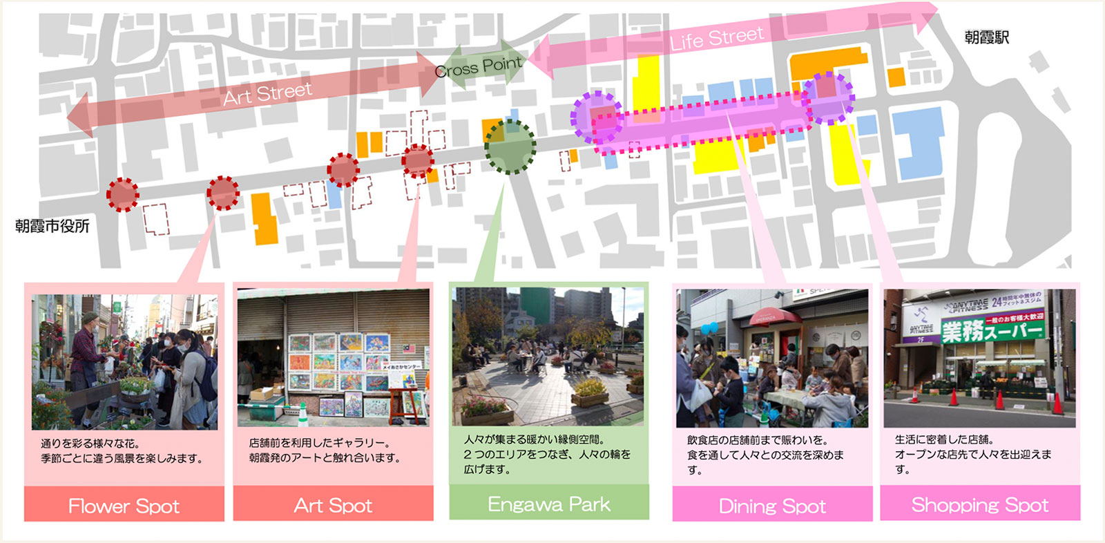 朝霞駅南口駅前通りを候補とし、駅前通のエリアごとの特色を活かし、店舗のにぎわいを道までにじみ出させ、人々の流れを商店の奥まで呼び込む。駅前の飲食店やスーパーなど生活に密着する「Living Street」エリア、空き店舗等を有効活用する「Art Street」エリア、中間地点で駅西口富士見通線との結節点の「Cross Point」エリアなど。